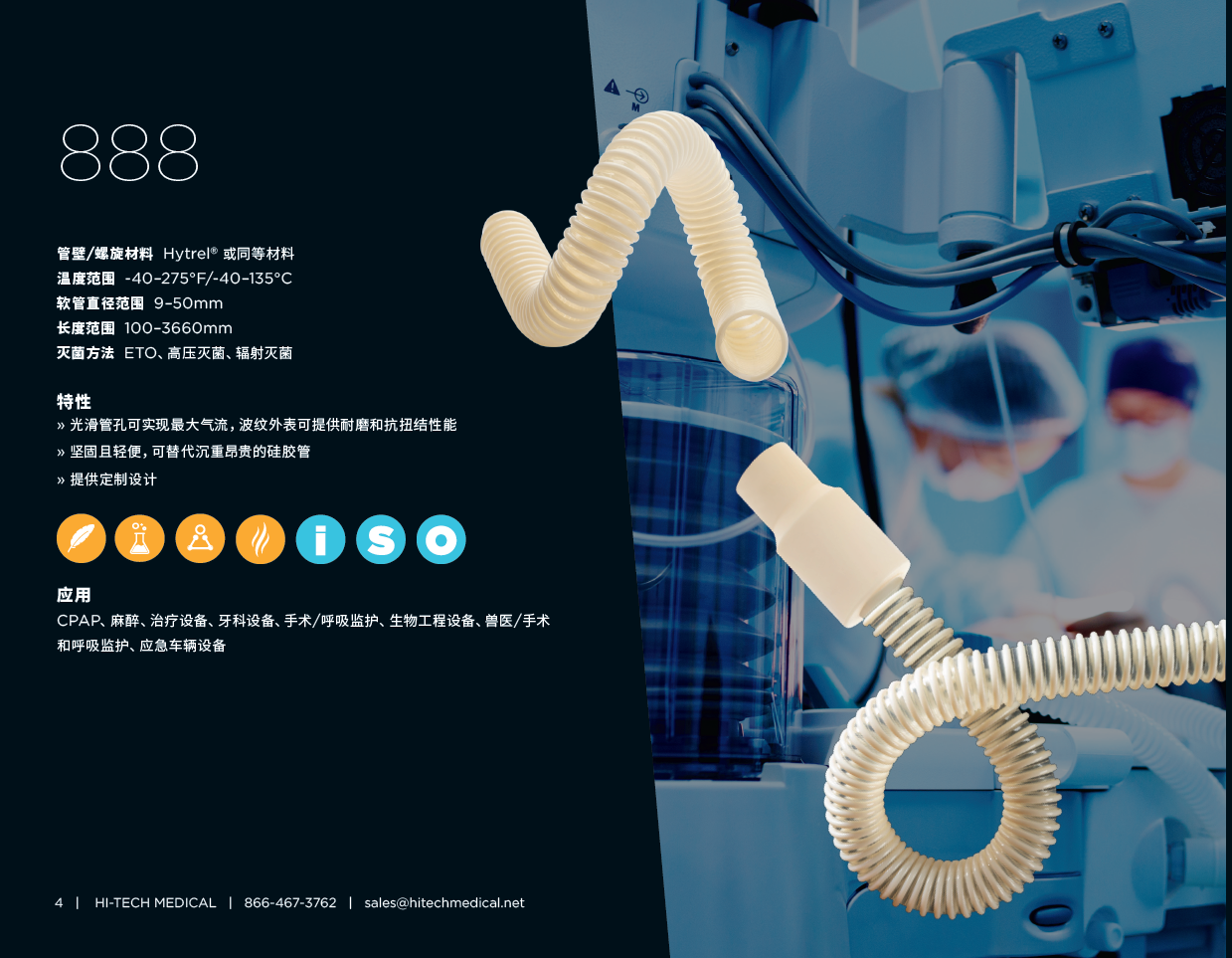 第888章产品简介:坚固轻便、无味、耐化学腐蚀、环氧乙烷、可高压灭菌广泛应用:CPAP、通气管、激光排烟、麻醉、治疗设备、牙科设备READ MORE >第888章产品简介:坚固轻便、无味、耐化学腐蚀、环氧乙烷、可高压灭菌广泛应用:CPAP、通气管、激光排烟、麻醉、治疗设备、牙科设备READ MORE > -