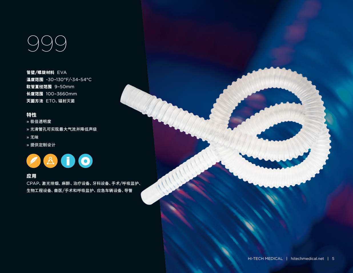 第999章产品简介:坚固轻便、无味、耐化学腐蚀、环氧乙烷、可高压灭菌广泛应用:CPAP、通气管、激光排烟、麻醉、治疗设备、牙科设备READ MORE >第999章产品简介:坚固轻便、无味、耐化学腐蚀、环氧乙烷、可高压灭菌广泛应用:CPAP、通气管、激光排烟、麻醉、治疗设备、牙科设备READ MORE > -
